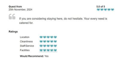 "Lisa and Rob were welcoming and friendly and I felt nothing was too much for them which made my stay very enjoyable Highly recommended, you will get a standard of service that a hotel would find hard to match!"